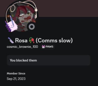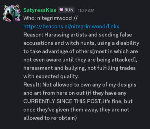 Reasons:TOS conflicts with mineShe is rude & escalates to swearing.Creates characters again if someone rehomes & she doesn't like the person but doesn't have them blocklisted!Messaged my (ex) wife to start drama after month+I redesigned a character into an oni and they thought it was great idea to buy it and send it to someone I have blacklisted.